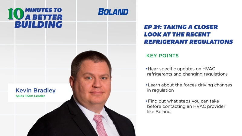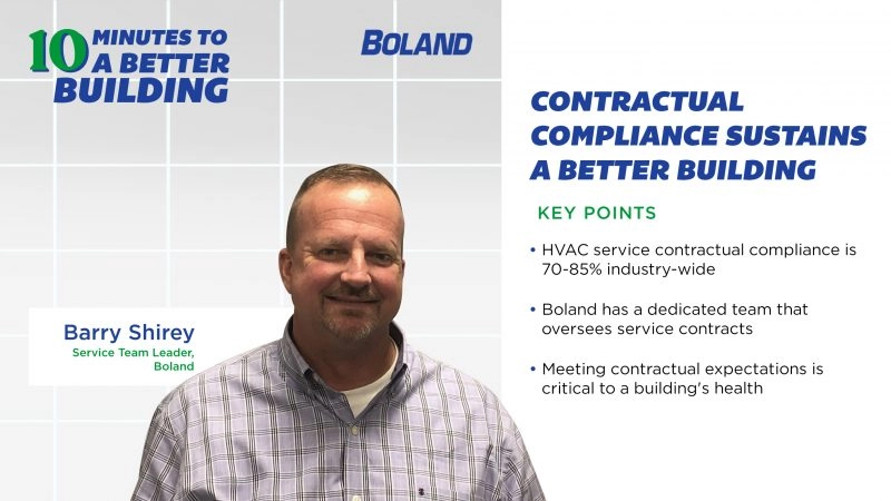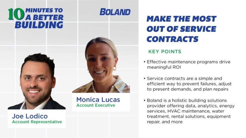On this episode of Boland’s 10 Minutes to a Better Building, host Tyler Kern was joined by Boland’s Joe Lodico, Account Representative, and Monica Lucas, Account Executive. The trio explored a critical piece of any organization’s effort to get the most out of their facilities and their investment in them – service contracts. “A…