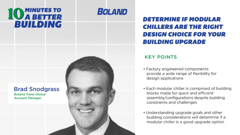 Brad Snodgrass, global account manager at Boland Trane, explained to Host Tyler Kern about modular chillers’ benefits and how Boland works with customers to ensure an upgrade is the right move for them. Instead of the traditional physically separated chillers, modular chillers have one point of electrical connection with a factory control component—this means a…