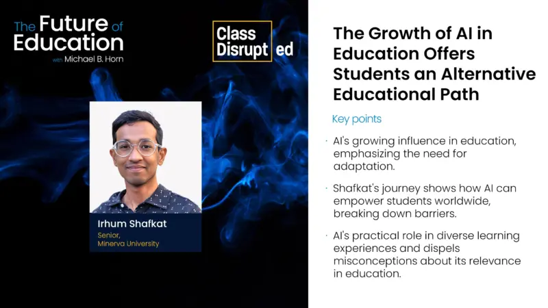 On the latest episode of “The Future of Education: Class Disrupted,” hosts Michael Horn and Diane Tavenner take a deep look into the rapid growth and advancements of AI in education and its implications for education. To better understand how AI is making change with students and in general, the two interviewed Irhum Shafkat,…